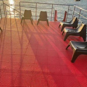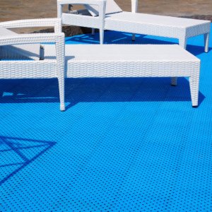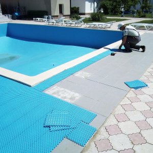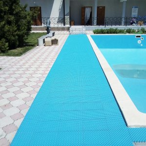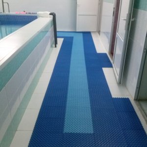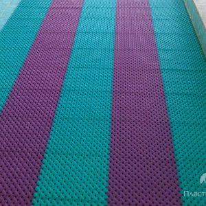 Напольное покрытие, изготовленное в компании «ПластФактор», является принципиально новым противоскользящим покрытием для бассейнов, бань и саун. Оно состоит из отдельных модулей, каждый из которых оснащен дренажной системой. Благодаря ей вода свободно стекает в отверстия модуля и удаляется из помещения через слив, протекая под смонтированным покрытием.