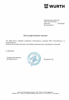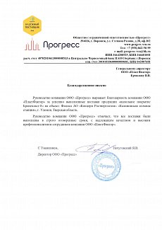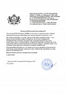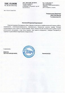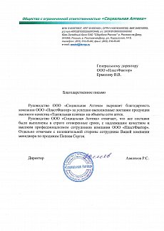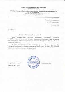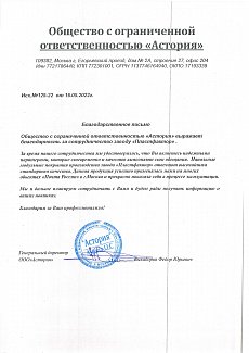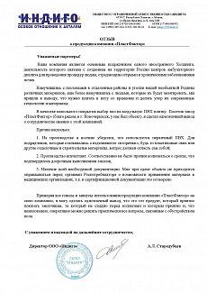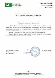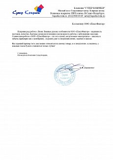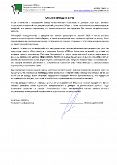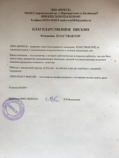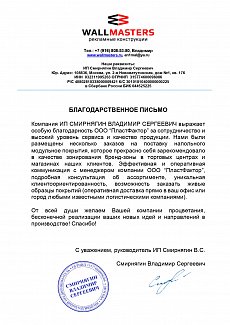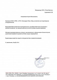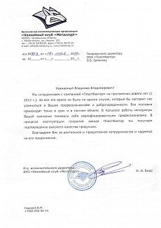 Выражаем большую благодарность за продуктивное сотрудничество заводу «Пластфактор». Мы работаем с вами на протяжении четырёх лет (с 2018 года). За это время, с вашей помощью, мы смогли привлечь новых покупателей и значительно расширили рынок сбыта. Особенно хотелось бы отметить минимальные сроки изготовления заказа, для многих клиентов это важно. Спасибо за своевременное изготовление и отгрузку напольных модульных покрытий. Надеемся, что в будущем мы продолжим успешное сотрудничество.